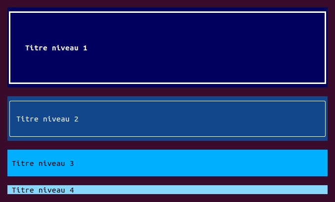 print(TµAnsi::title4("Titre niveau 4"));