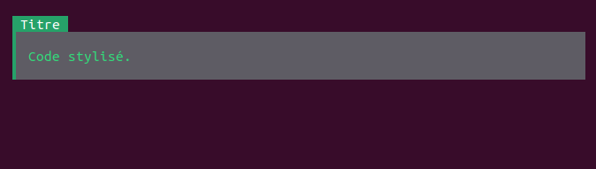 print(TµAnsi::block('code', "Bloc de code."));